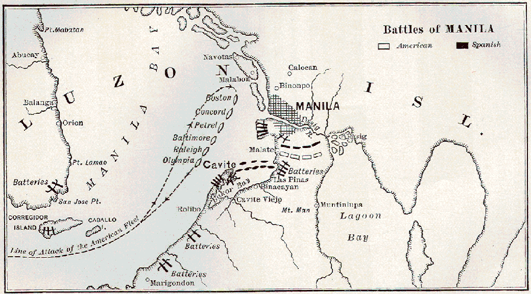 Fought May 1, 1898, between the American squadron of 6 ships, under Admiral Dewey, and 11 Spanish vessels, chiefly small, and unarmored. The Spanish fleet was totally destroyed, the Americans suffering no loss. | ||